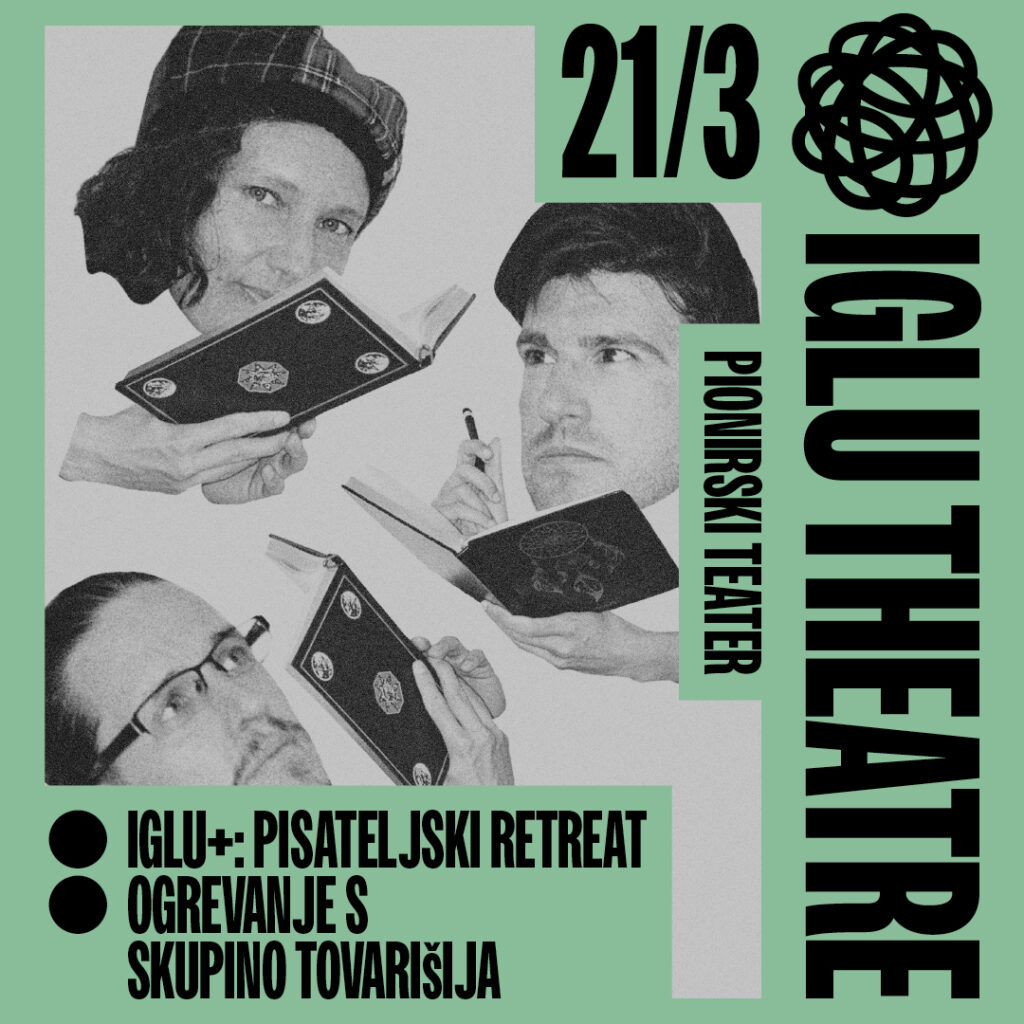 & Tovarišija Dvojni impro večerEkscentrični bogataš povabi izbrano število pisateljev na svoj dvorec na pisateljski retreat. Tam jim bo razkril, zakaj so bili povabljeni in kako se morajo izkazati. IGLU+ vas vabi na večer igranja z besedami in še čim …Še prej pa bo skupina Tovarišija z improvizirano predstavo ustvarila edinstvene zgodbe, ki nastajajo tukaj in zdaj, pred očmi občinstva. Izhodišče so predlogi gledalcev, iz katerih improvizatorji gradijo prizore, like in odnose, polne nepričakovanih obratov. Vsak večer je neponovljiv preplet humorja in domišljije.